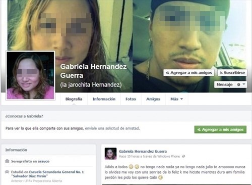 Ngày 5/11, cô gái 22 tuổi đã đăng một status bằng tiếng Latinh với nội dung: “Hôm nay tất cả mọi thứ sẽ kết thúc. Em yêu anh! Vĩnh biệt tình yêu của tôi!”. Gabriela đăng status này kèm với một bức ảnh khóc lóc.